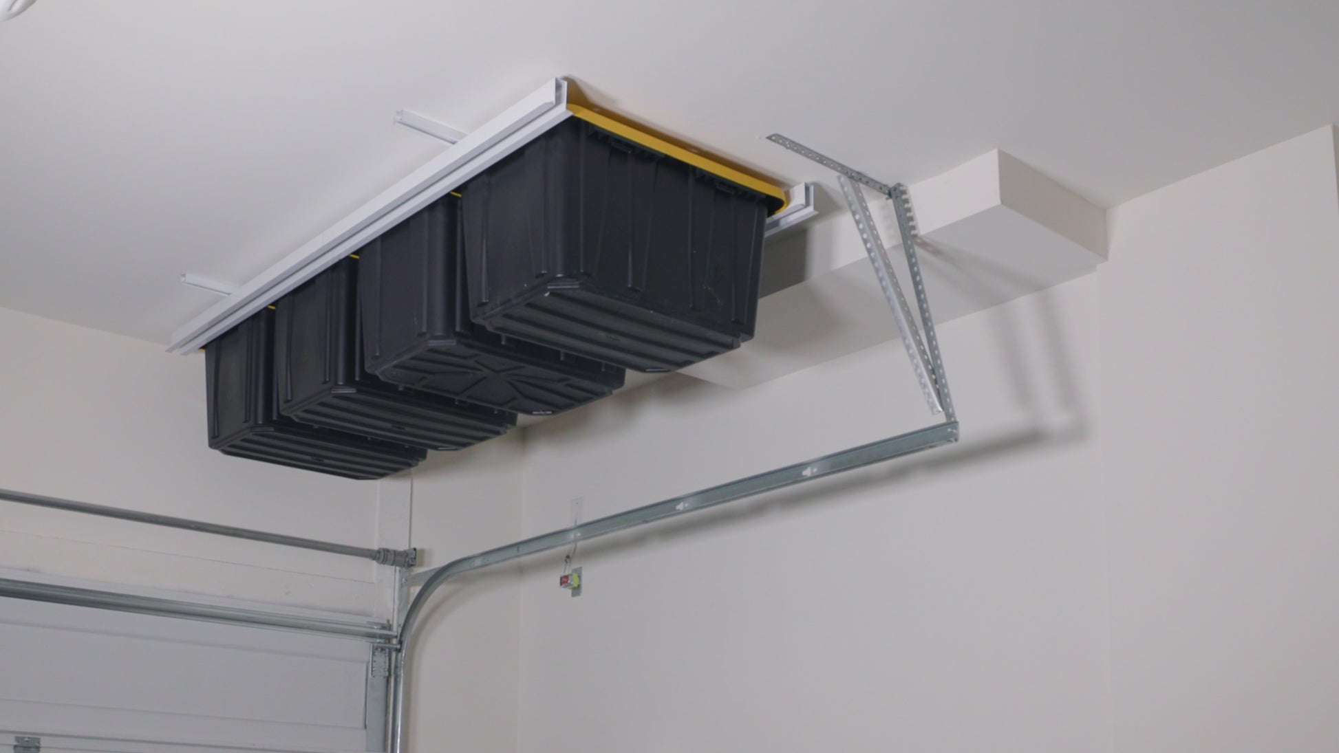 The Tote Ceiling Organizer offers a secure and efficient way to organize your storage containers on the ceiling.